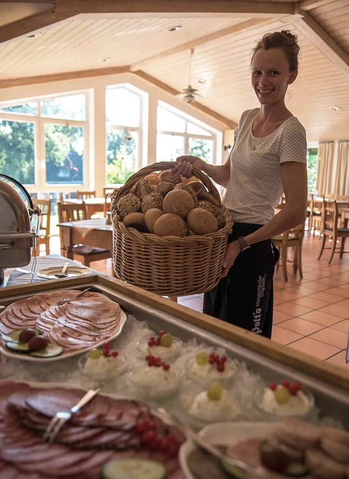 Starten Sie in den Tag mit einem Frühstück auf dem Lande. Mit unseren täglich gebackenen Brötchen, Brot und Stuten aus der Hofbäckerei. Dazu Ei, Wurst, Schinken und Marmelade.